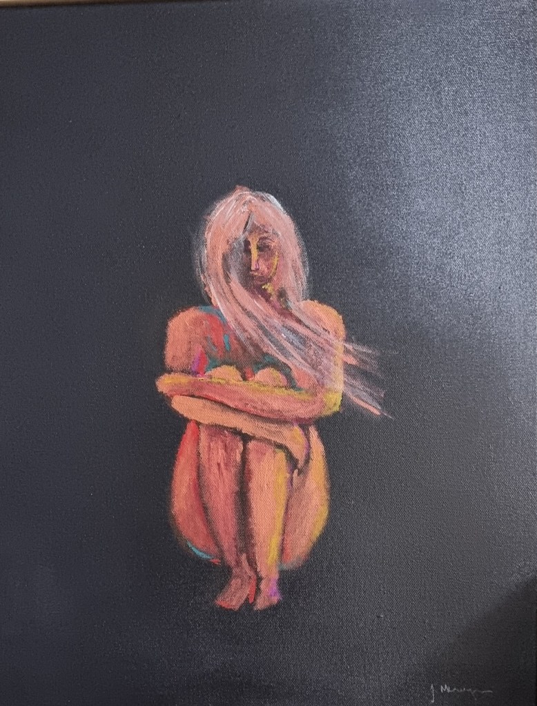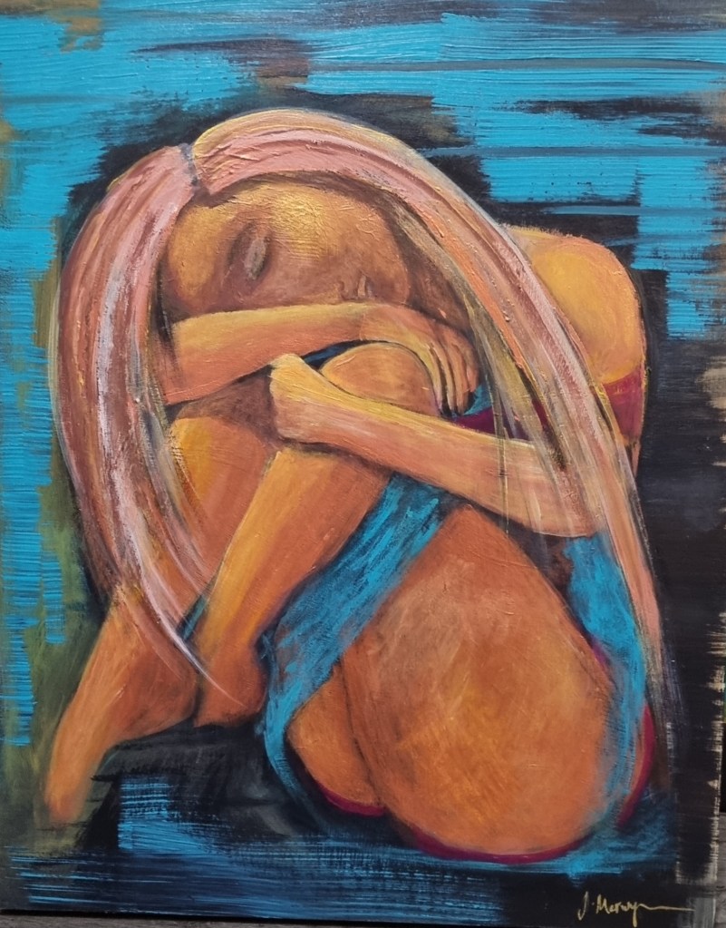 Within the captivating canvas of ‘God’s Embrace,’ a woman sits, her body gently embracing her knees, a symbol of introspection and vulnerability.