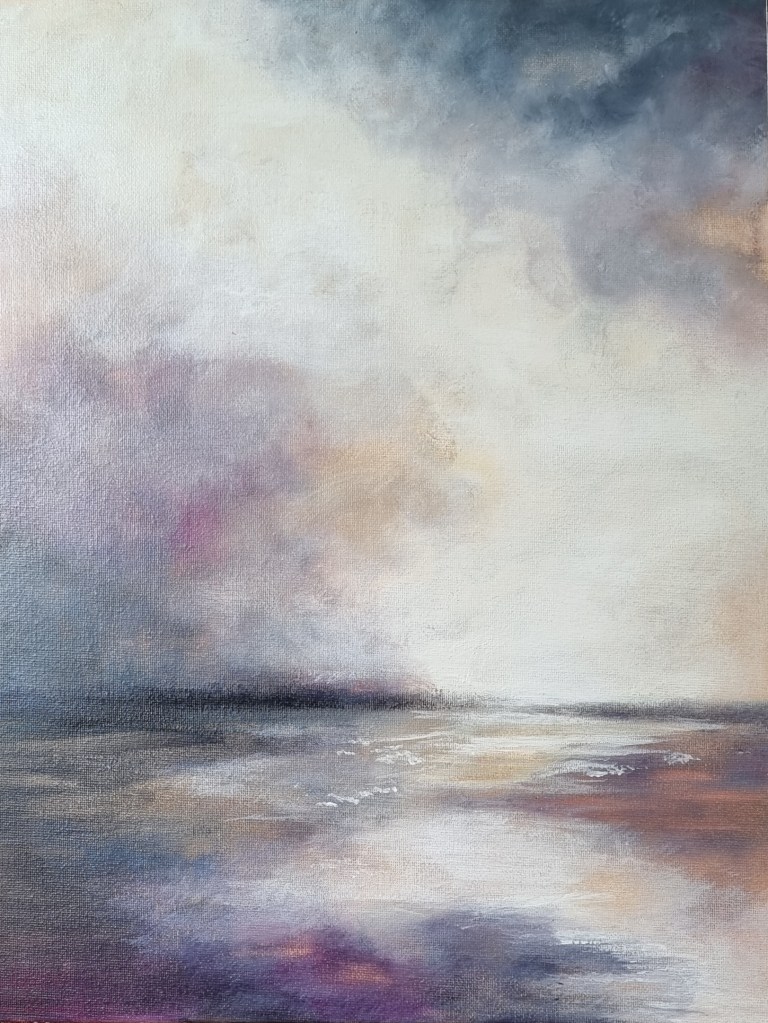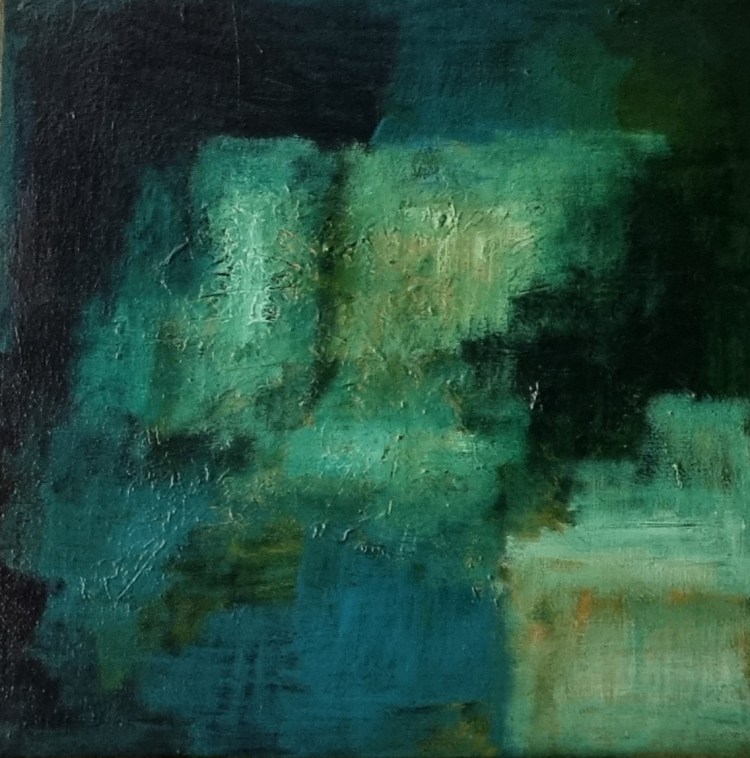 “Dreaming of the Amalfi Coast” started off as an intuitive artwork. Once I had added the cobalt blue I was reminded of the Mediterranean. Although I got to see some parts of Italy, I haven’t seen the Amalfi Coast. I have images of the Amalfi Coast that I have saved and looked at for a long time. These became my inspiration for this painting. I wanted the buildings to be colour and line rather than a realistic shape so that the water of the Mediterranean is the main focus. When I think of Italy, I think of the beautiful colours of the buildings, so different from here. For now I continue to dream of the Amalfi Coast and one day I will get to see it.”