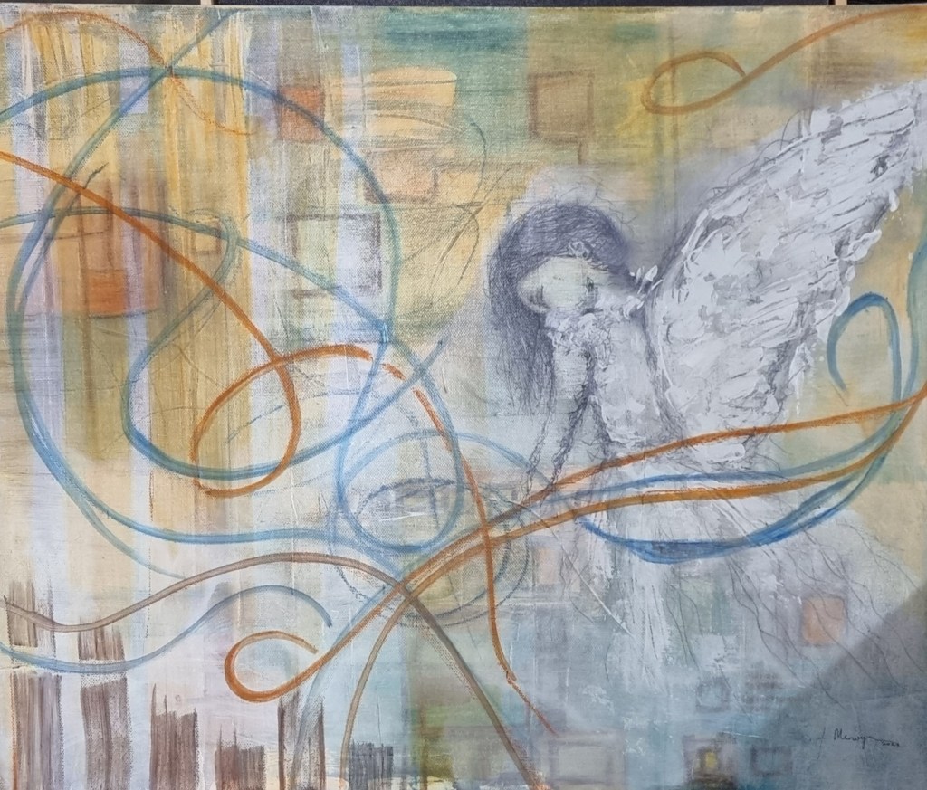 “In ‘Guardians of Grace,’ a youthful angel graces the canvas, her form emanating tenderness and serenity. With her wings outstretched, she stands watchful, a celestial guardian gazing over a cityscape below. The softness of her face and body mirrors her role as a gentle guide, offering solace and reassurance.”