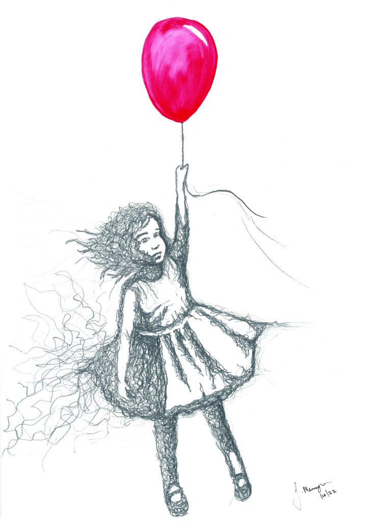 “This scribble art drawing was initially a gift for my husband. It was the 25th Anniversary of our baby girl Therese born sleeping. Approx 4 years after her death I had a dream of her running in a field in a little dress with curly hair. This is the first of a series of scribble art drawings enlarged as a print on canvas to represent the connection with our children but also remembering that they have been entrusted to us to care for, they don’t ‘belong’ to us.”