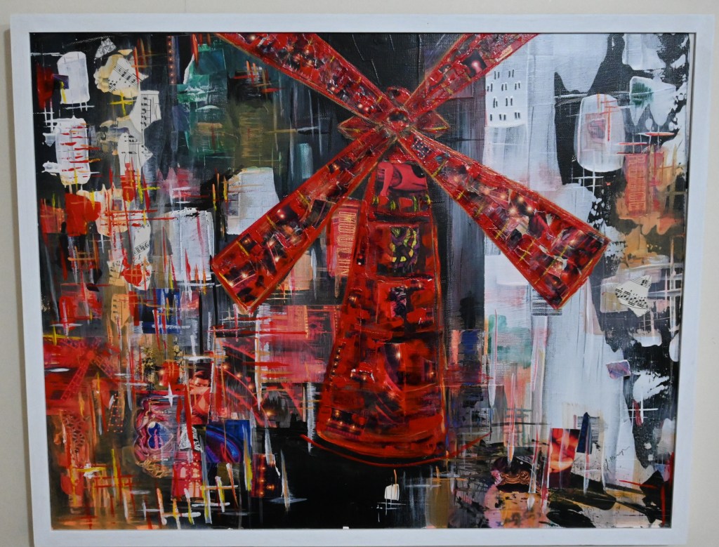 This painting is made from the program from the Moulin Rouge the Musical. Representing the colors of the nightlife. All are welcome at the Moulin Rouge.